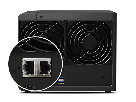 DS416 內建支持故障移轉及 Link Aggregation 的雙網絡埠,在其中一個網絡埠故障的狀況下,仍可確保聯機繼續,降低服務中斷的可能性以及因停機所造成的昂貴成本。此外,Link Aggregation 充分發揮雙網絡埠的優點,可提升連接速度,突破單一網絡線或網絡埠的速限。