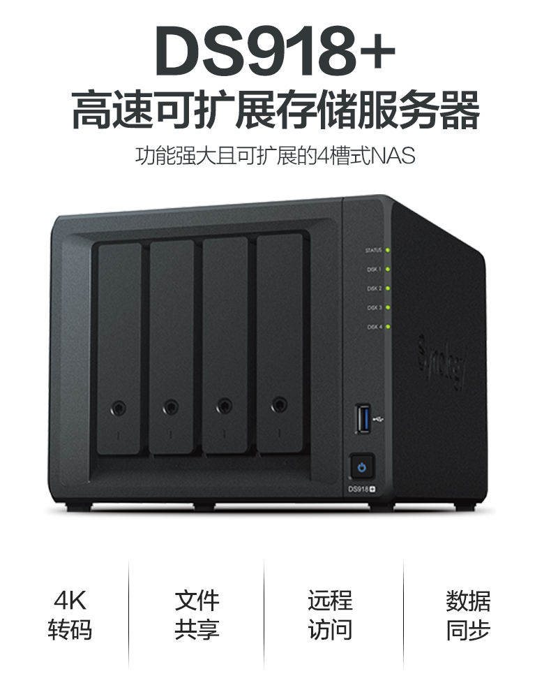 DS918+ 支持多達兩個 M.2 NVMe 2280 SSD,無需占用內部硬盤插槽即可快速創建系統緩存。DS918+ 可通過 Synology 擴充設備 DX517 擴展到多達 9 個硬盤,滿足了對靈活存儲容量的需求。