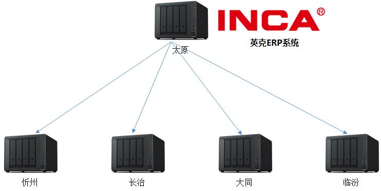 五個分公司各采購一臺DS918+,以太原為中心,向其它分公司的DS918+進行數據實進下發(單向),同時太原中心的存儲與英克ERP進行了集成(JAVA二次開發),這樣,ERP的業務數據將自動存儲到DS918+的文件夾,隨后下發到其它分公司。