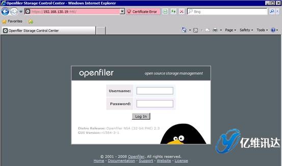 Openfiler 鏡像系統配置當 Openfiler 系統安裝并重啟完成后,對系統所有后續的配置過程,都是以 Web 方式配置完成的。這種全部基于 Web 的系統配置方式,使得配置過程變得更加簡易,同時也帶來了良好的用戶體驗。首先打開瀏覽器,輸入地址:https://IP:446。注意,此處輸入的 IP 地址為在系統安裝時所配置的固定 IP 地址。然后使用系統初始默認的用戶名和密碼進行登陸。用戶名為 openfiler,密碼為 password。系統初始的用戶名和密碼可以在第一次登入系統后進行重新設置。如圖所示。