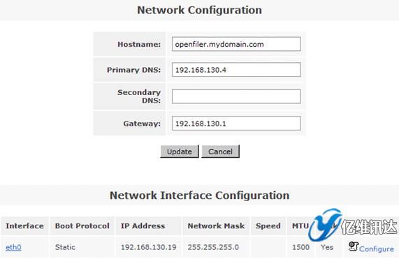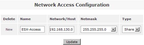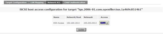 在系統菜單“System”菜單下的“Network Access Configuration”區域,配置允許訪問 Openfiler 系統的安全訪問控制列表。值得注意的是只有加入到 Openfiler 的網絡訪問控制列表中的網絡或者主機地址,才允許訪問 Openfiler 系統所提供的虛擬存儲服務。在網絡訪問控制列表中,既可以配置網段地址也可以配置單個主機地址。在本例填入 192.168.130.0 網段,設置類型為“Share”方式,添加完成后點擊“Update”完成系統配置更新。如圖