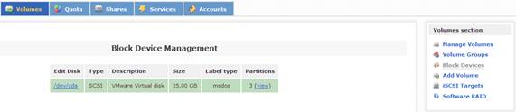 當配置好系統的安全訪問控制后,接下來的一步是配置系統磁盤,實現虛擬存儲服務。在 Openfiler 中,有三類存儲概念:Block Device,Physical Volume 和 Volume Group。其中,Block Device 表示的是實際的物理磁盤;Physical Volume 表示的是物理磁盤的分區,它是組成 Volume Group 的單元;Volume Group 則是由一個或多個物理磁盤分區(Physical Volume)組成,它又是組成 Logical Volume 的單元。